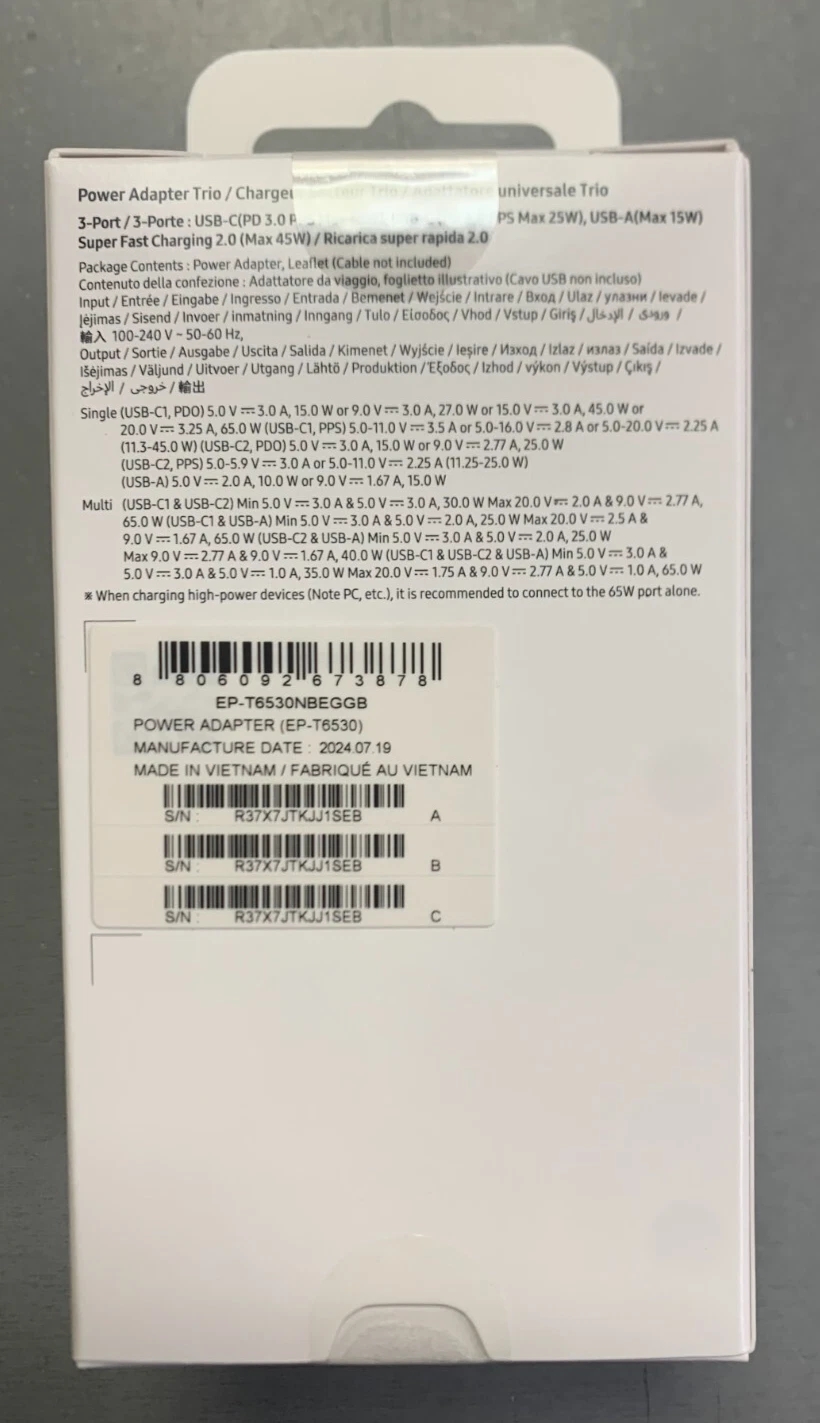 - 1 x Official Samsung Universal 65W Black Trio USB-C and USB-A UK Plug