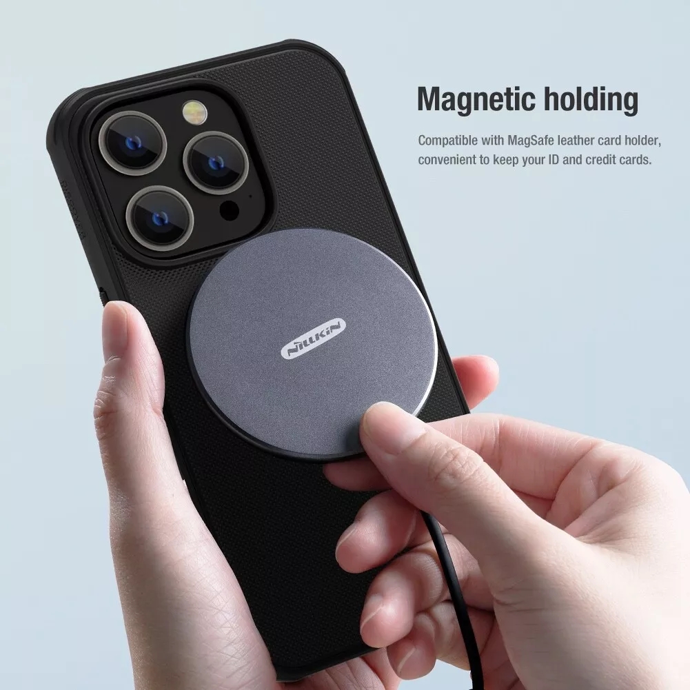 Back protective cover Super Frosted PRO Magnetic from Nillkin brand with integrated magnet for Apple MagSafe accessories. Compared to the classic Super Frosted, the cover is made of two materials and equipped with a magnet. It is perfectly processed and absorbs shocks well.
